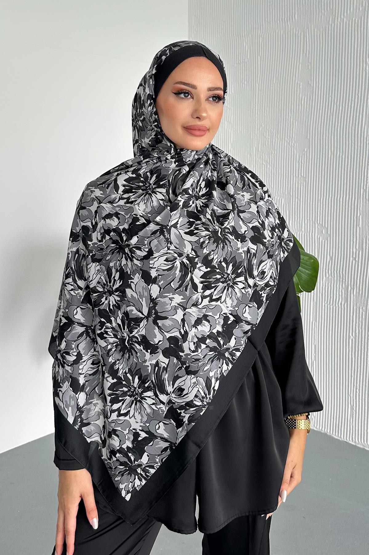 Lotus Çiçek Desen Siyah Renk Soft Pamuk Şal