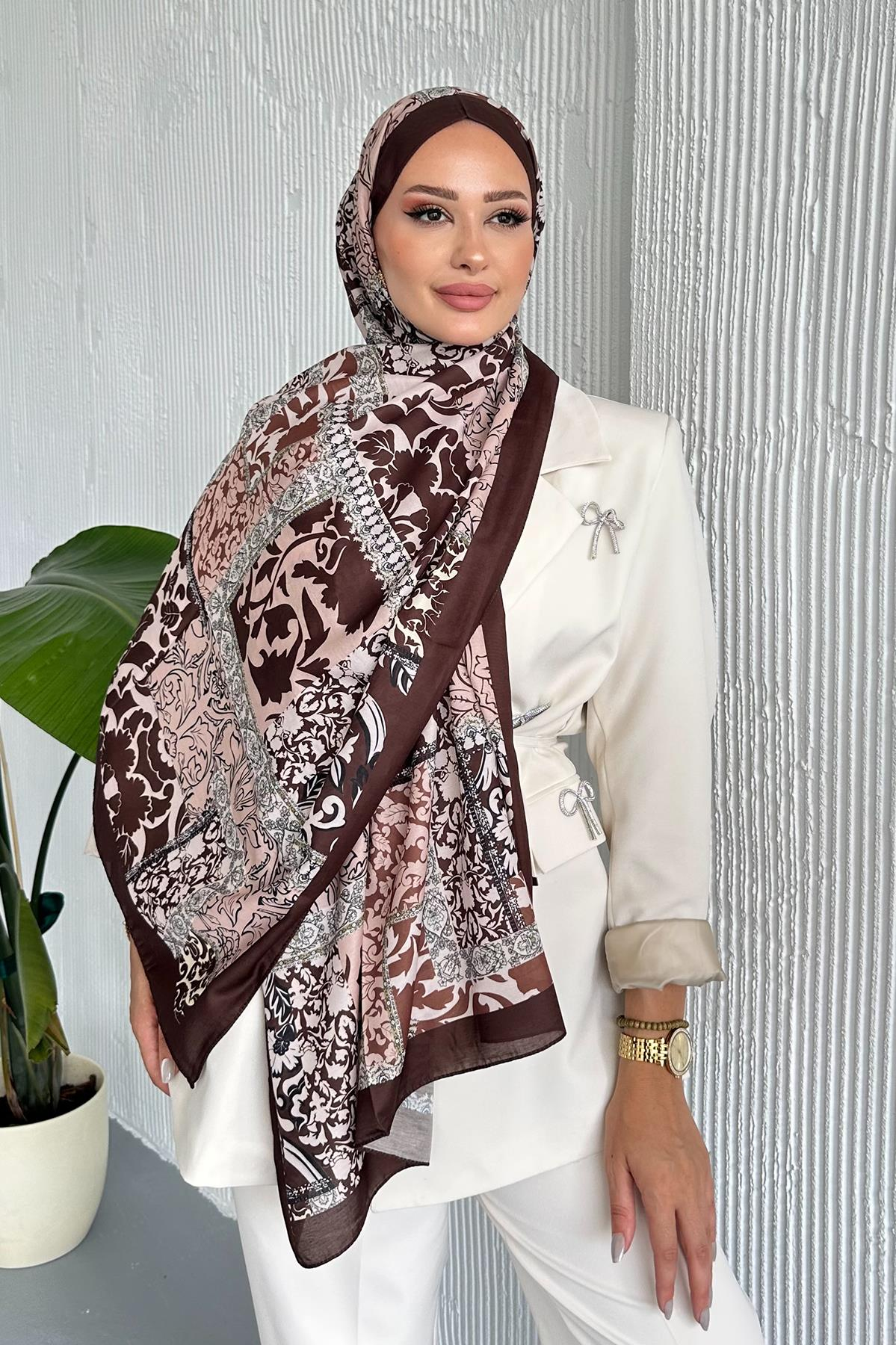 Patch Etnik Desenli Kahverengi Soft Pamuk Şal